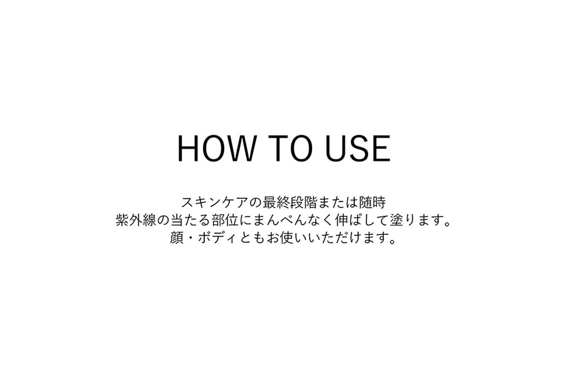 [使用方法]基礎化粧品で肌を整えた後、本製品を適量とり肌にまんべんなく塗り広げます。日焼けを防ぎたいとき随時塗ってください。