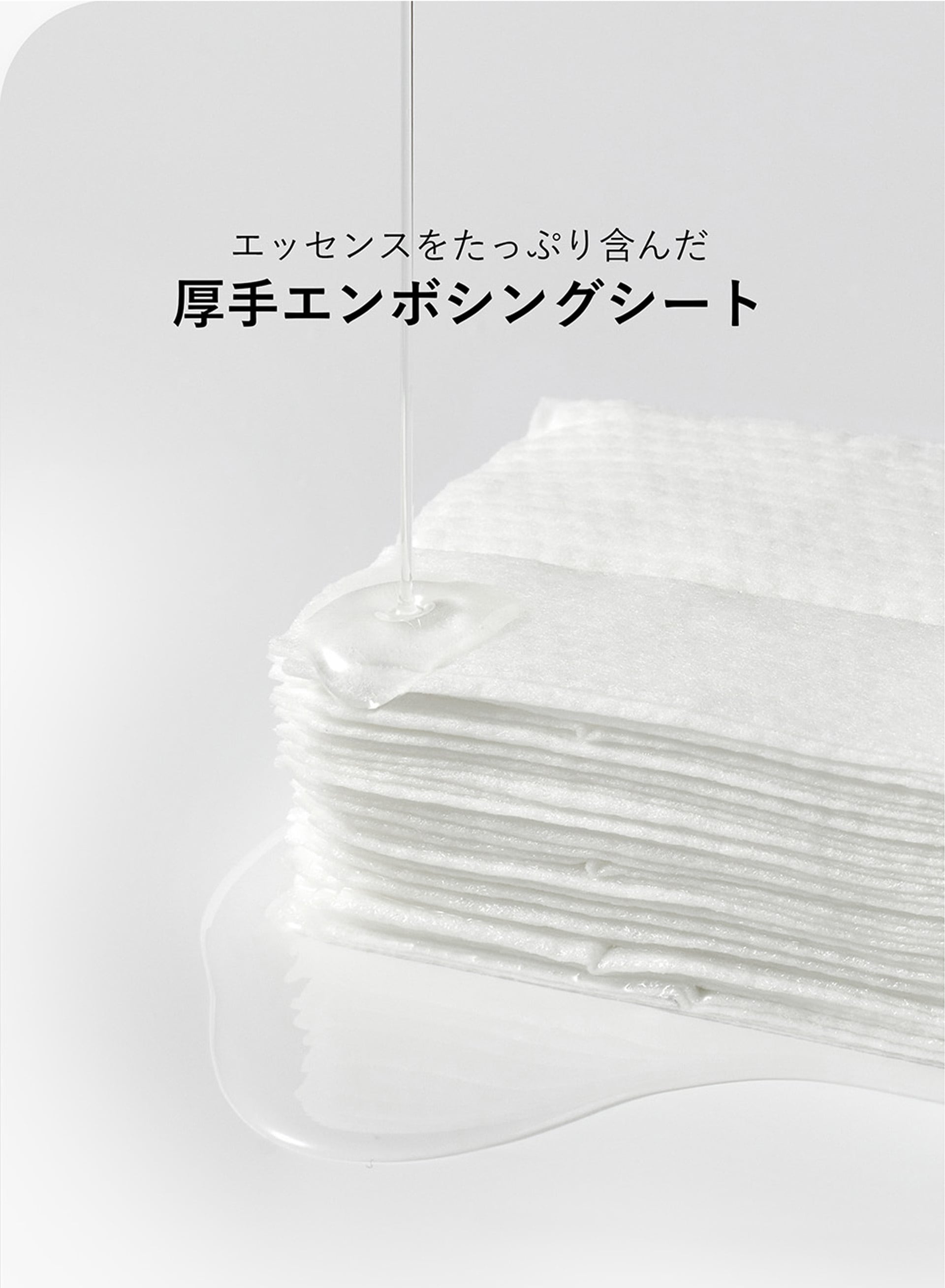 [使用方法]シートを1枚ずつ取り出し、肌のキメに沿って内側から外側にやさしく拭き取ります。