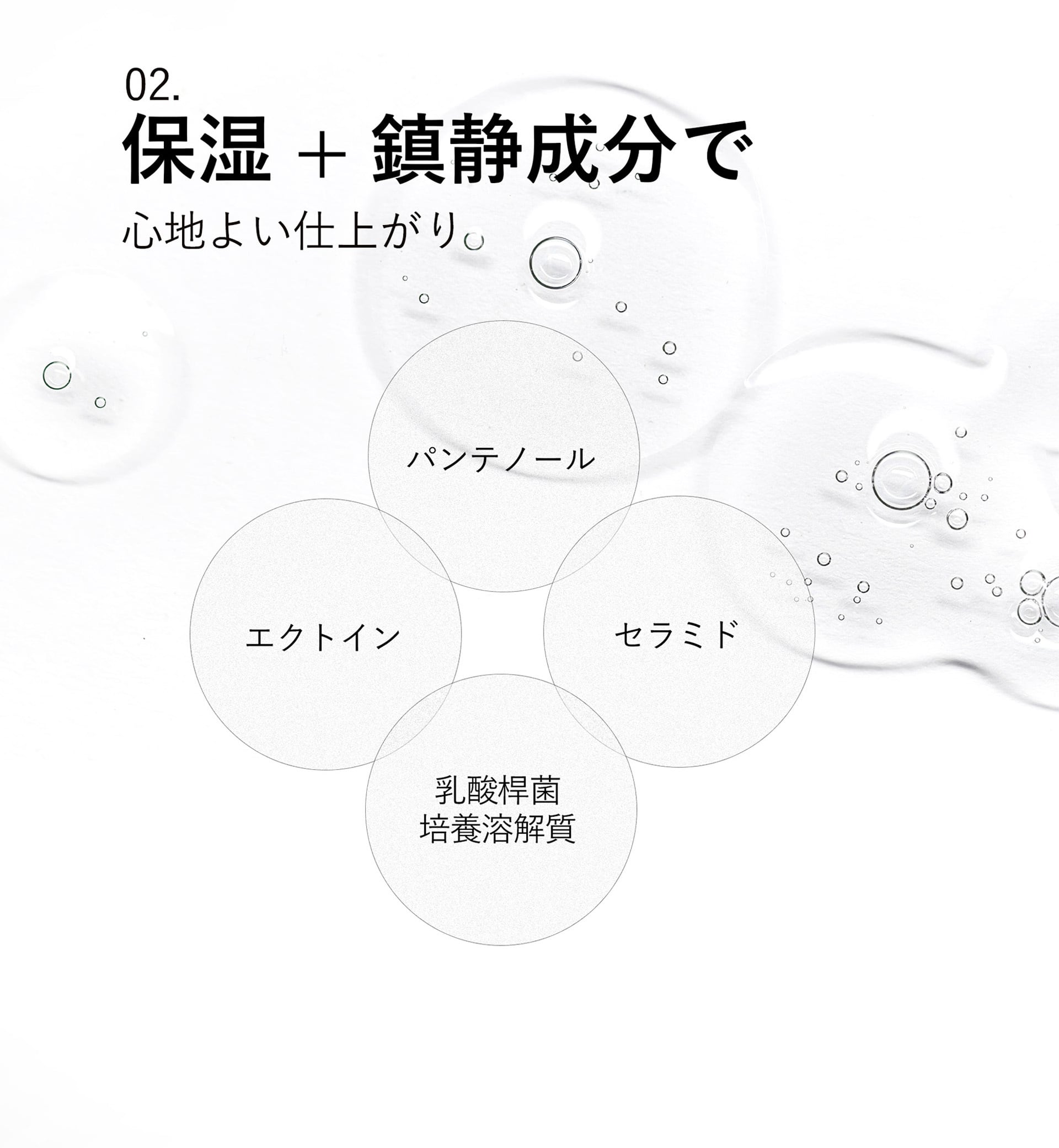 [全成分]水、グリセリン、ラウリルベタイン、ココアンホジ酢酸2Na、ヤシ油アルキルグルコシドクエン酸2Na、ココイルグルタミン酸Na、塩化Na、1,2-ヘキサンジオール、スクロース、ヤシ油アルキルグルコシド、デシルグルコシド、コハク酸、ペンチレングリコール、カプリン酸ポリグリセリル-4、香料、プロパンジオール、グリチルリチン酸2K、フィチン酸Na、イソステアリン酸ポリグリセリル-10、ヘキシレングリコール、オレイン酸ポリグリセリル-10、ダイズ種子エキス、BG、オクタンジオール、フナバラソウエキス、エチルヘキシルグリセリン、タチアオイ花エキス、ブロメライン、エクトイン、パンテノール、パパイン、アボカド油脂肪酸ブチル、乳酸桿菌培養溶解質、トリ(カプリル酸/カプリン酸)グリセリル、水添レシチン、セラミドNP、クエン酸、グルコノラクトン、プロテアーゼ、サッカロミセスセレビシアエエキス、トコフェロール、コレステロール、カプリロイルサリチル酸、サリチル酸、パルミトイルグリシン、レシチン、エスシン、シトステロール、マカデミア種子油、スクワラン、スクロースオクタ硫酸Al、アブラナステロールズ、ラウロイルグルタミン酸ジ(オクチルドデシル/フィトステリル/ベヘニル)、サーファクチンNa、セルロース、EDTA-2Na